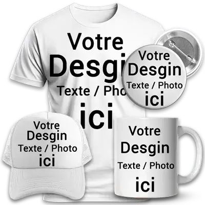 Notre éditeur de personnalisation en ligne vous permet de créer facilement des t-shirts personnalisés, mugs, casquettes, badges, tapis de souris et bien plus. Simple et intuitif, il fonctionne sur ordinateur, tablette et téléphone.