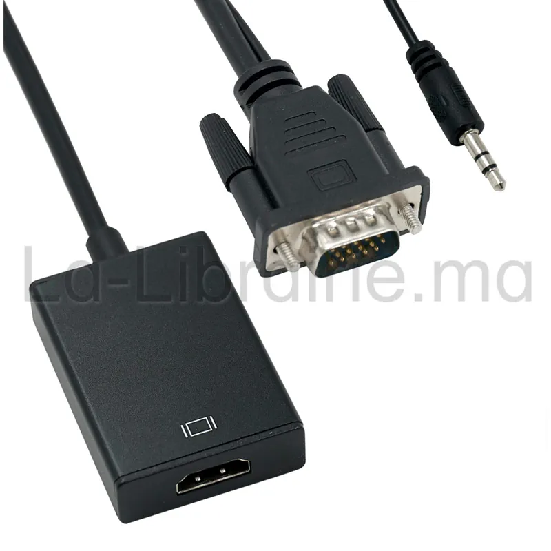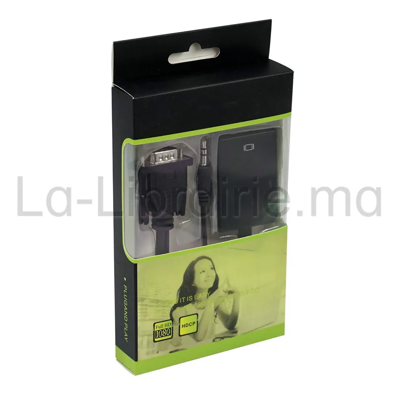 Cet adaptateur VGA vers HDMI permet de connecter un PC ou un ordinateur portable à un téléviseur ou un écran HDMI. Il convertit le signal VGA en sortie vidéo numérique jusqu’à 1080p. Grâce à la prise jack 3,5 mm intégrée, il transmet également le son.