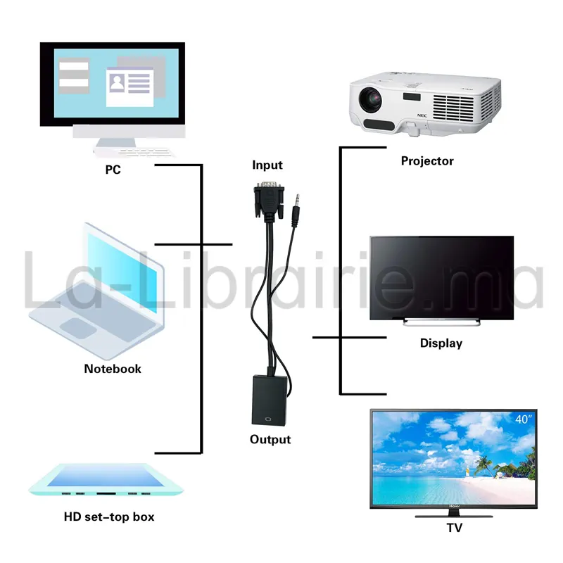 Vous branchez facilement un ancien appareil équipé de VGA à un projecteur, un écran plat ou une TV récente. Le câble est léger et fonctionne sans configuration. Il offre une compatibilité étendue avec les systèmes Windows, macOS et Linux.