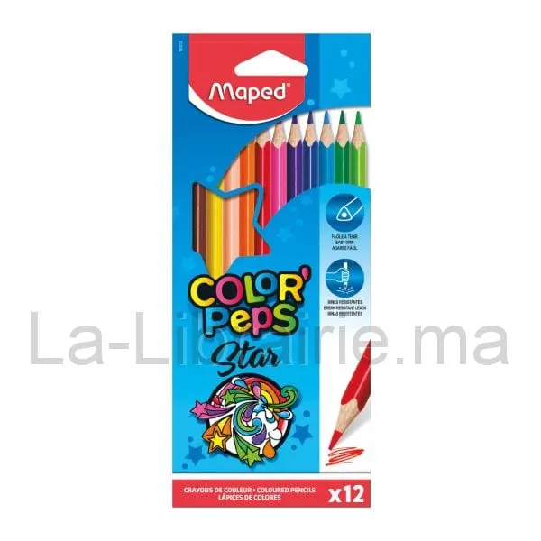 12 crayons de couleurs long Maped, mine douce et résistante à la cassure, corps à la couleur de l’encre, leur forme offre une meilleure prise en main et un plus grand confort pour les petites mains des enfants. Leur mine est extra solide avec son procédé d’assemblage unique.
