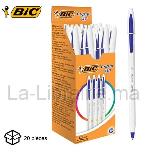 Boite 20 stylos cristal up, pointe moyenne, largeur de trait: 1,2 mm, corps hexagonal, avec système d’encre easy glide. Design qualitatif et tendance avec un corps blanc et un capuchon bicolore, couleur: bleu ( 20 pièces ).
