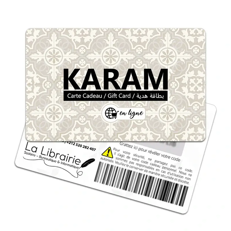 La carte cadeau en ligne « KARAM en ligne » est une véritable carte cadeau physique en PVC.