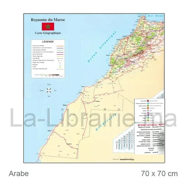 Carte géographique du Maroc en arabe avec villes et reliefs, dimension 70 x 70 cm, parfait pour les enfants, les étudiants en géographie, les enseignants et plus encore.