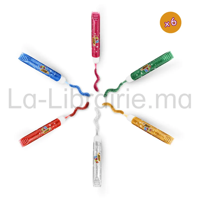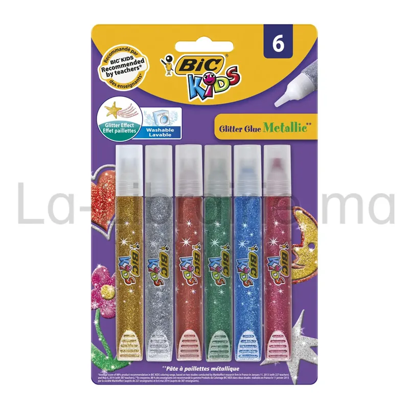 La colle pailletée métallique BIC Kids contient 6 tubes de couleurs vives : colle pailletée or, colle pailletée argent, colle pailletée rouge, colle pailletée vert, colle pailletée bleu et ccolle pailletée rose. Chaque tube applique une pâte épaisse avec un effet pailleté brillant. Elle adhère facilement sur le papier, le carton et d’autres surfaces poreuses.