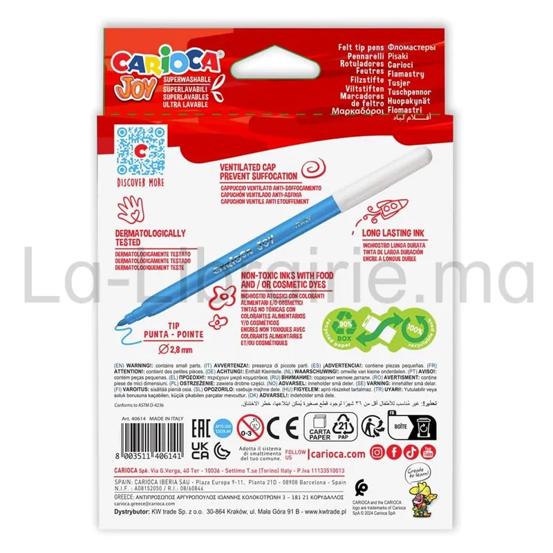 Fabriqués en Italie, les feutres Carioca Joy assurent qualité, sécurité et plaisir de coloriage au quotidien.
