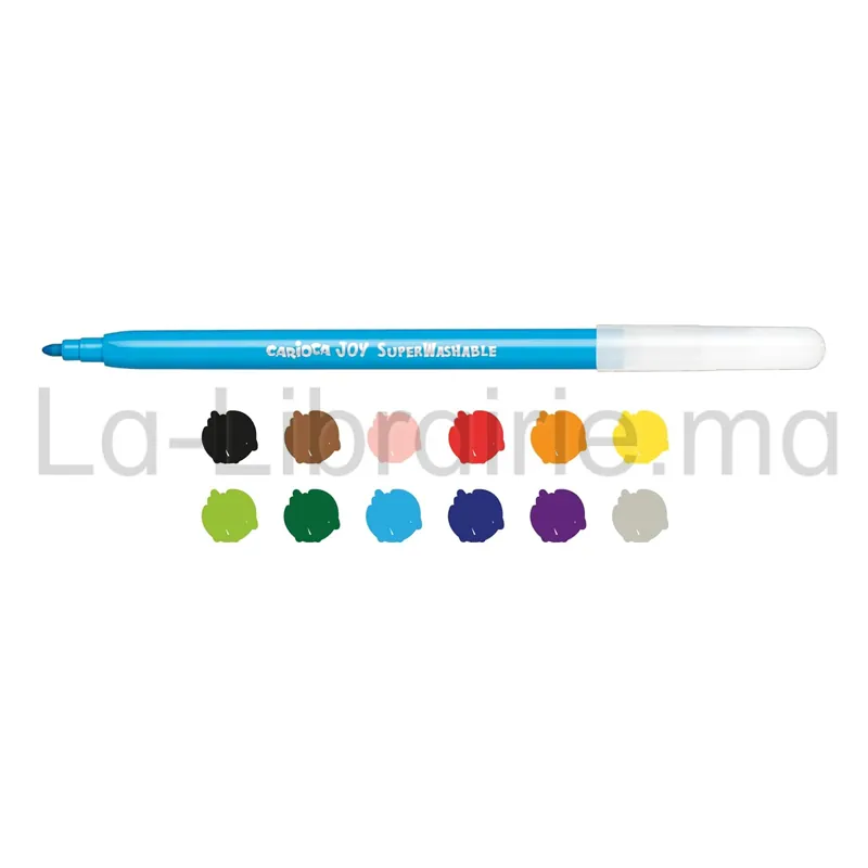 La pochette Carioca Joy contient 12 feutres de coloriage super lavables. Elle s’adresse aux enfants dès 3 ans. Chaque feutre possède une pointe fine de 2,8 mm, bloquée pour éviter qu’elle ne s’enfonce sous la pression.