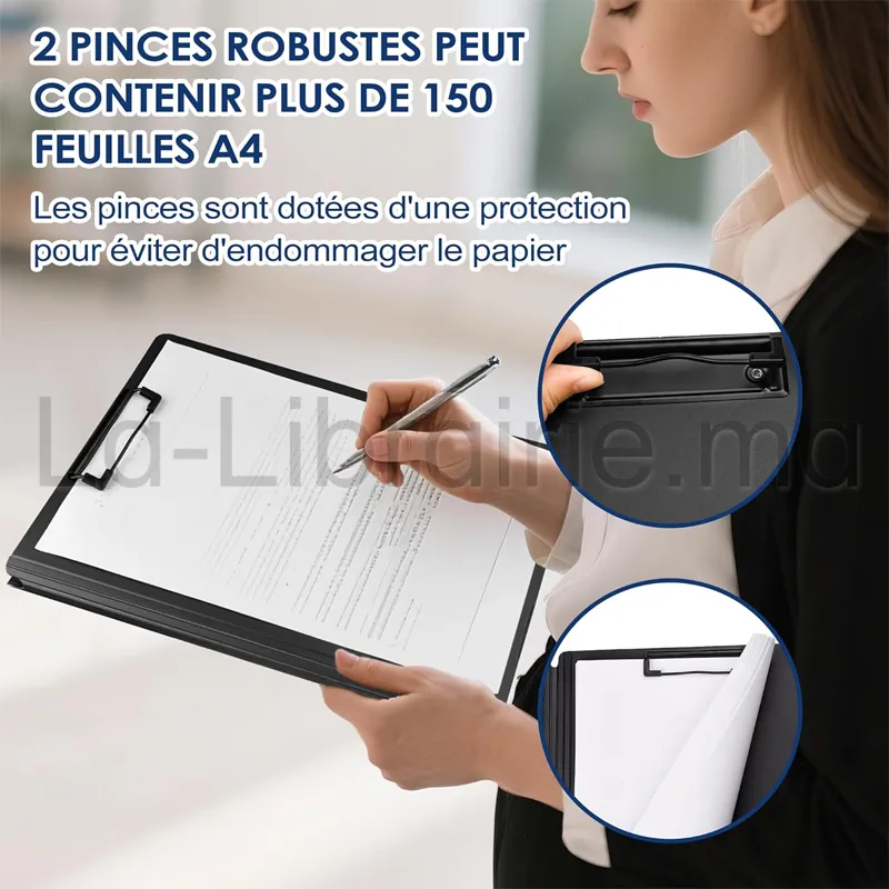 Le porte bloc double A4 à pince facilite la gestion de vos documents au bureau ou en déplacement. Il maintient solidement les feuilles A4 grâce à sa pince métallique renforcée. Vous écrivez confortablement sans support supplémentaire.