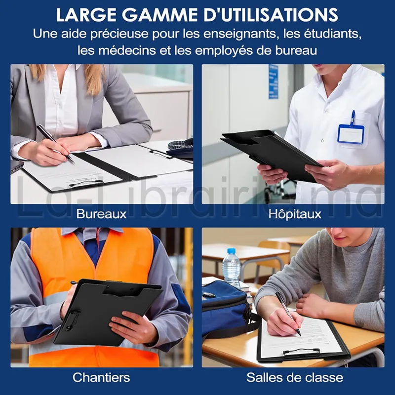 Ce porte bloc A4 convient parfaitement pour réunions, inventaires, interventions terrain ou usage scolaire. La couleur est envoyée aléatoirement selon disponibilité, parmi plusieurs teintes modernes. Il combine praticité, résistance et simplicité d’utilisation au quotidien.