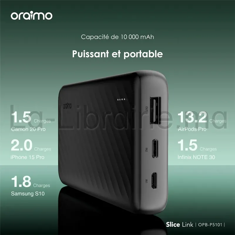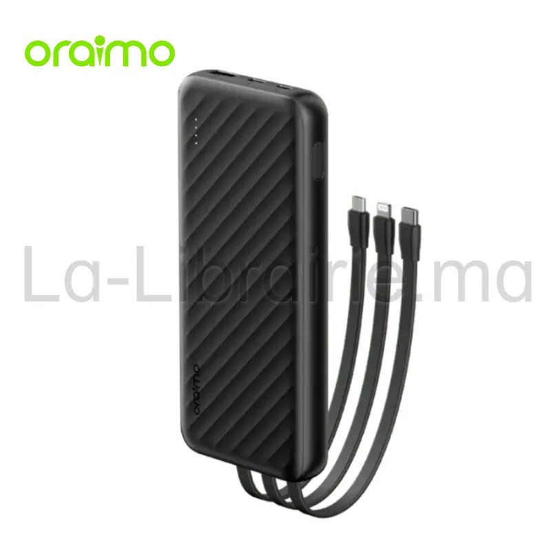 Ce power bank Oraimo 10000 mAh noir associe autonomie, compatibilité et vitesse. Il intègre une batterie lithium-polymère de haute densité, capable de délivrer une puissance de charge de 12W via sortie USB. Trois câbles sont directement intégrés : un câble Lightning pour iPhone, un câble USB-C pour les appareils Android récents, et un câble Micro-USB pour les modèles plus anciens. Vous pouvez donc charger plusieurs appareils sans adaptateurs supplémentaires.