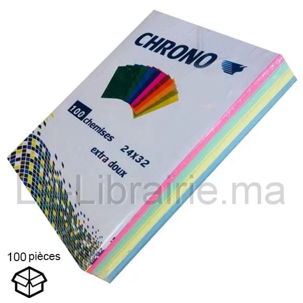 Pack de 100 chemises cartonnées, contient 4 couleurs: rose, verte, jaune, bleu-ciel, composée de carton extra doux de 180 grammes.