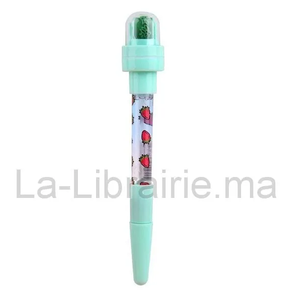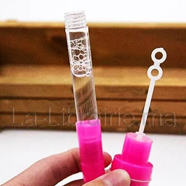 Stylo tampon et bulles de savon, le stylo 3 en 1 possède un côté stylo encre bleu, l’autre côté tampon encreur et au milieu des bulles de savon.